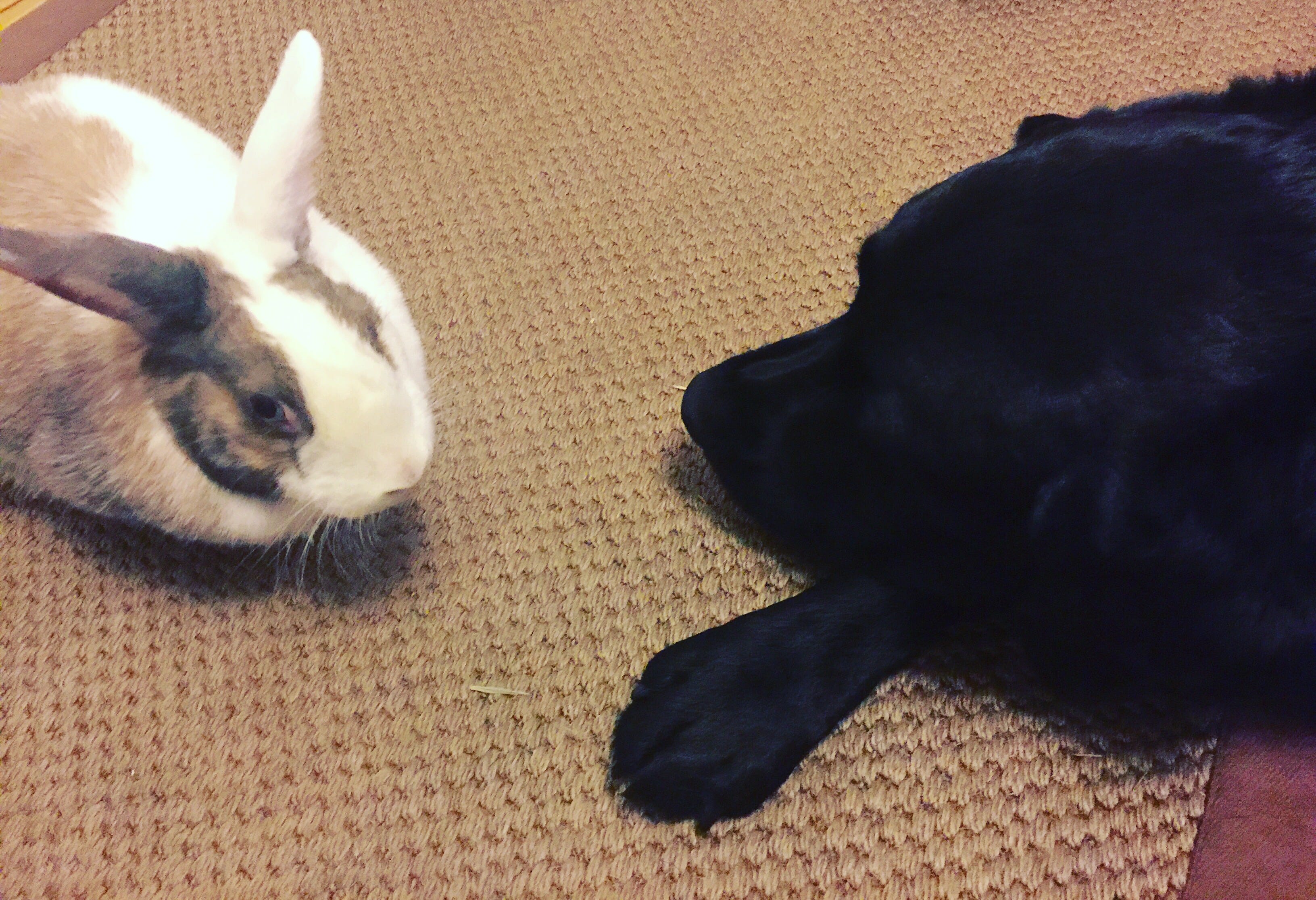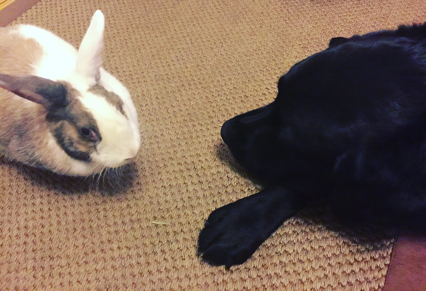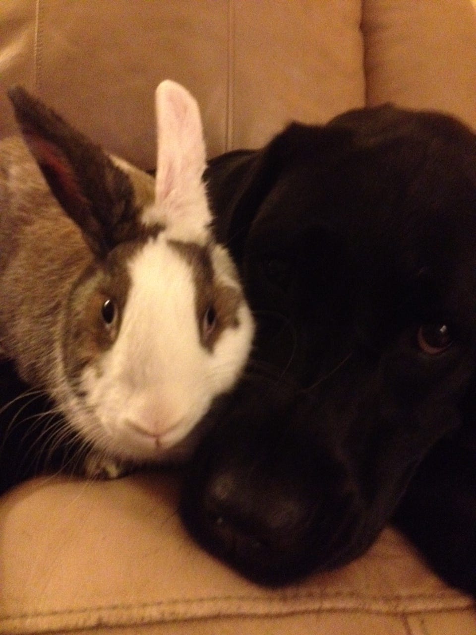 Yes, both pets were named after alcohol, and yes, they got along famously. An unlikely pair: a black lab and a bunny, coexisting in harmony—although Magner ruled the roost.